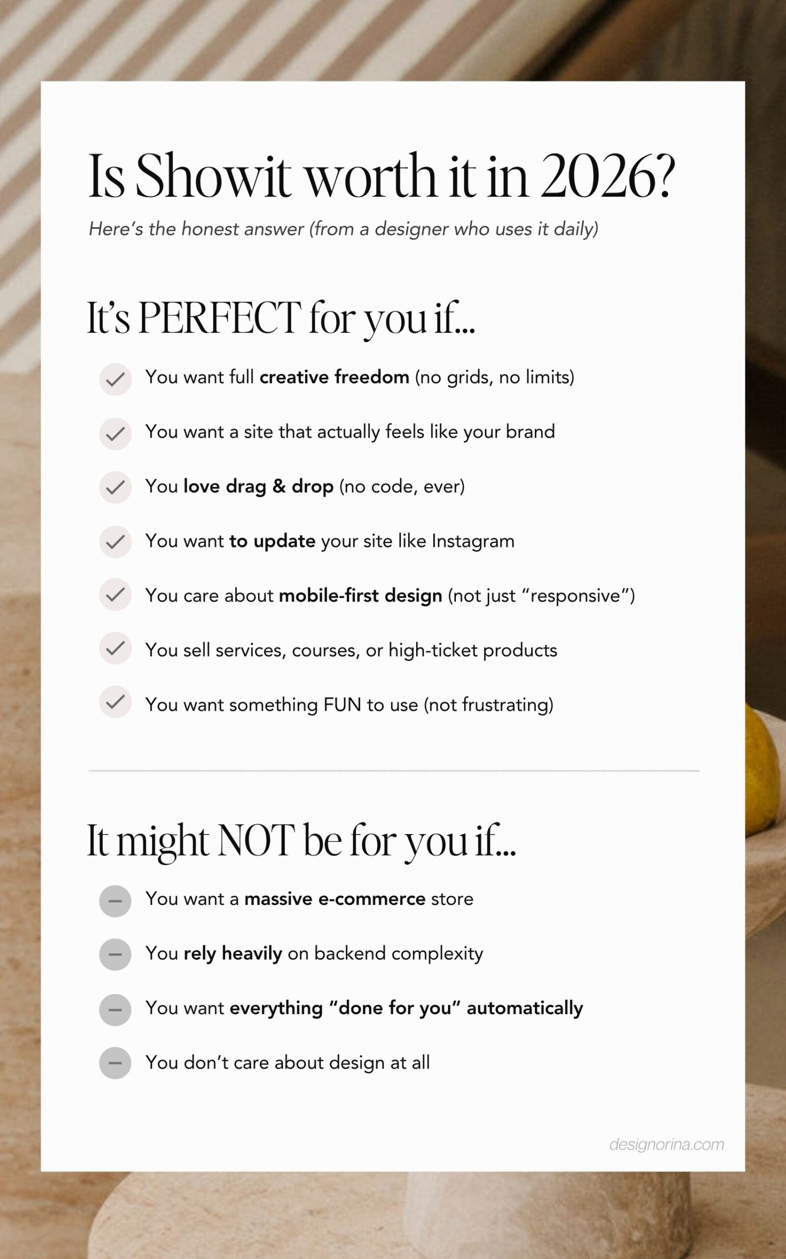 But if you want a site that actually feels like your brand, that you enjoy updating as your business evolves, that looks different from everyone else, and that’s built for how people browse in 2026 — Showit is kind of unmatched.