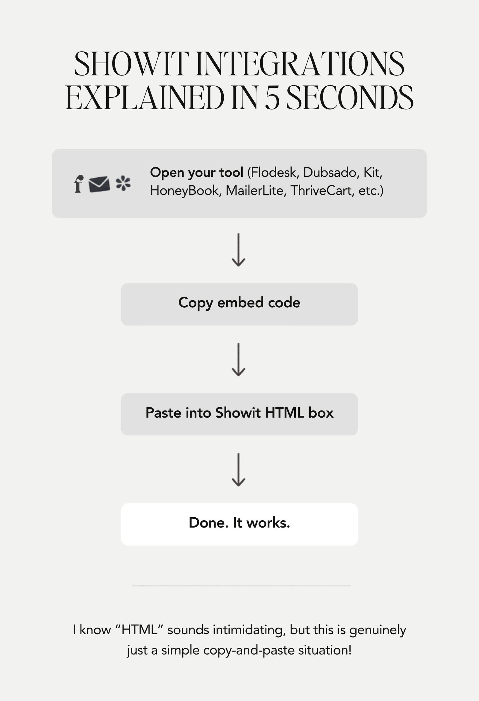 You can connect Flodesk, HoneyBook, HubSpot, Dubsado, ConvertKit, MailerLite, ThriveCart, WooCommerce — whatever is part of your setup — directly to your Showit site. It all integrates seamlessly using a simple HTML embed.